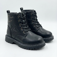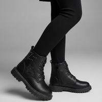 Ce modèle en simili cuir premium est décoré d’une étoile glitter noire et de petits studs métalliques, apportant une touche moderne et brillante que les enfants adorent ⭐.